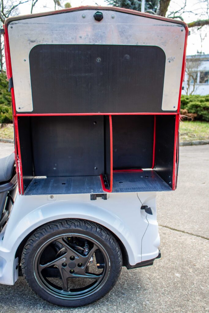 W trakcie pokonywania zakrętów tylna część nie przechyla się, dlatego pojazd może bezpiecznie przewozić w tylnym bagażniku ładunki o masie do 45 kg oraz do 20 kg w bagażniku przednim.